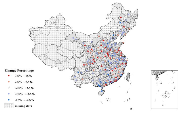2015-2019年我国各地级市常规公交客流量变化比例示意图