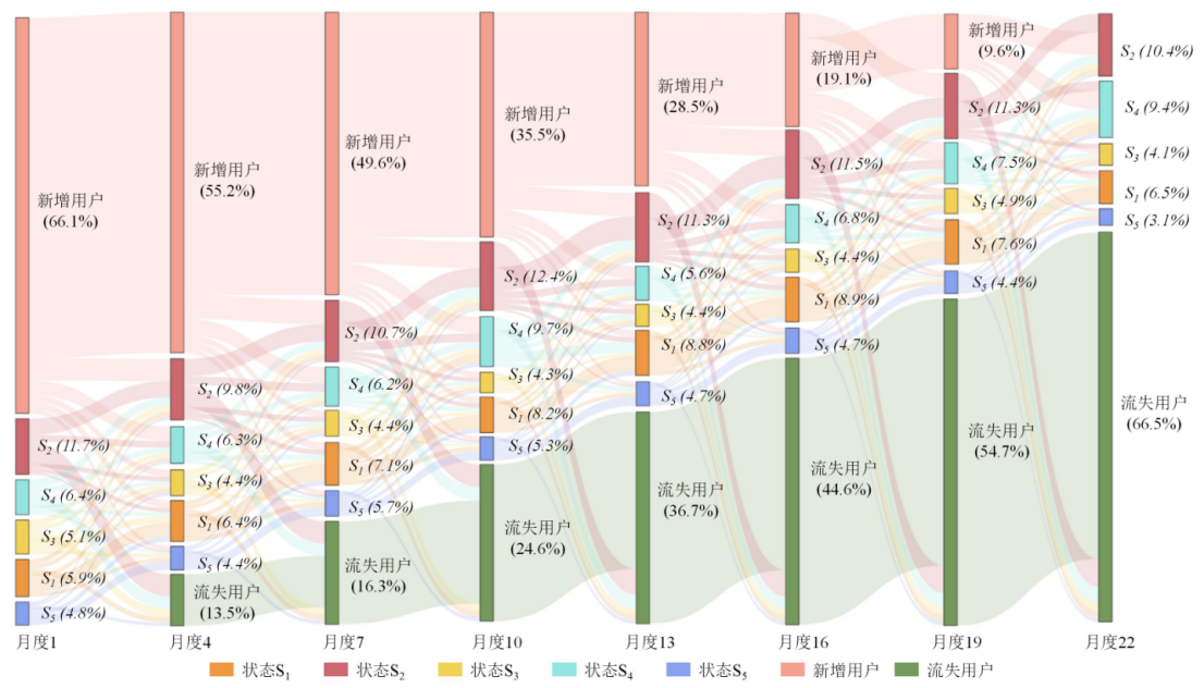 深入到个体层面,研究团队借助公交智能卡的长期行为数据,揭示了用户从使用公交到流失的全过程。通过创新的多视图分析方法,将用户行为状态划分为高频规律、中频规律、中频非规律等五类。研究发现用户流失并非突然发生,而是存在清晰的渐进路径:频率的逐步下降和由“规律”向“不规律”的习惯改变,是流失之前最重要的两个信号。此外,通过生存分析发现,不同用户的状态停留时间从几天到数百天不等,表现出显著的个体异质性,这进一步印证了针对用户个体的精准挽留措施的必要性。这一部分的相关研究成果发表在交通运输领域顶级期刊Transportation Research Part D: Transport and Environment。
