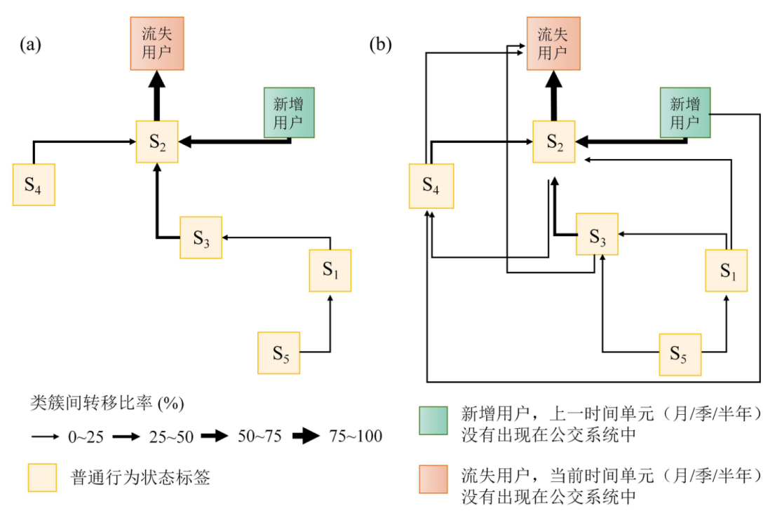 常规公交用户流失关键路径图模型(a)考虑1阶最大转移概率;(b)考虑2阶最大转移概率